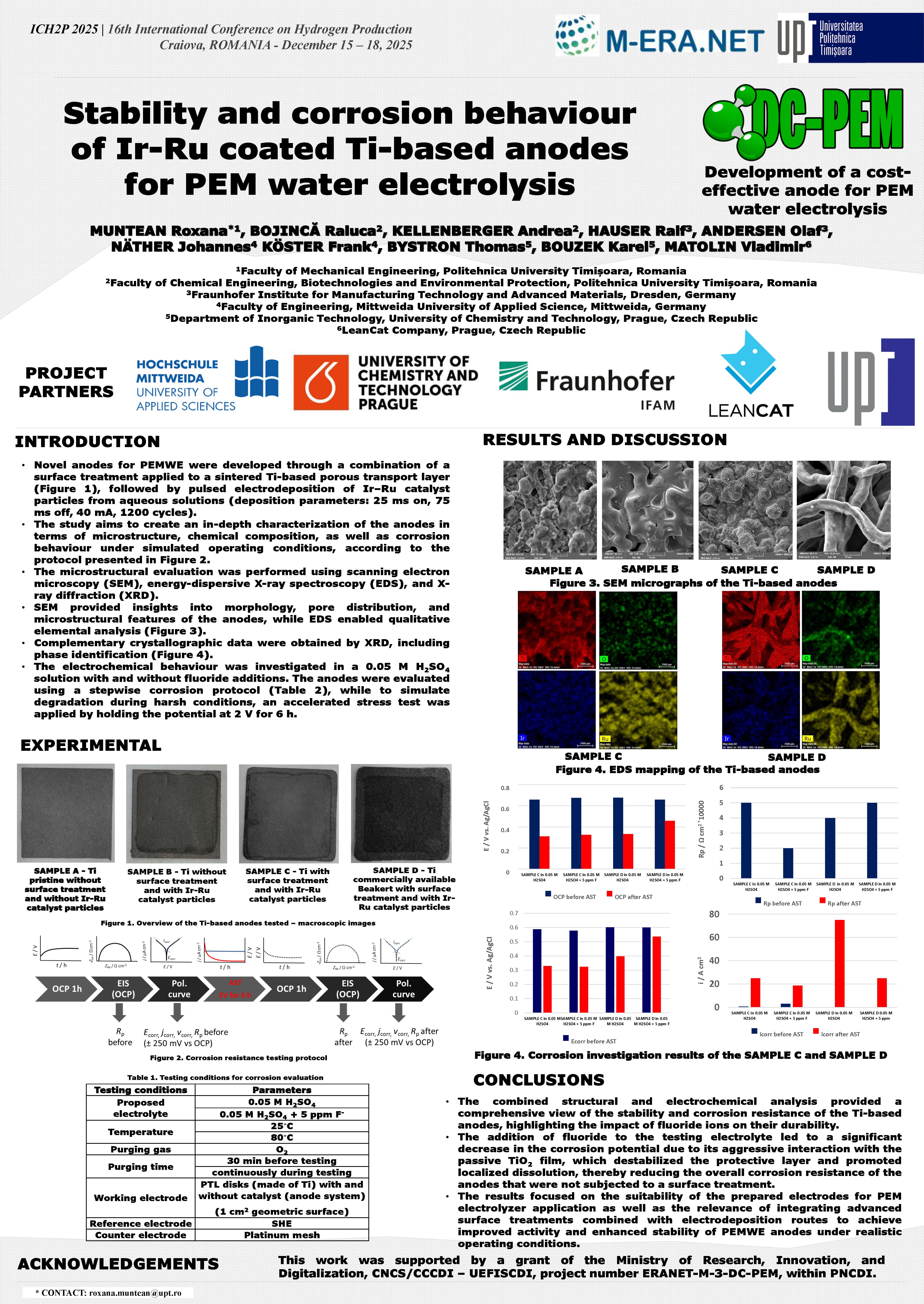 Descriere proiect: Electroliza PEM a apei reprezintă o tehnologie cheie în vederea tranziției sectorului energetic către hidrogen, ca purtător de energie și stocare a acesteia. Proiectul actual își propune să adapteze procesele de fabricație ale componentelor din partea anodică, astfel încât să se atingă o producție mai rentabilă a electrolizoarelor PEM, din punct de vedere financiar. Totodată, pentru a crește performanța celulei electrolitice, accentul trebuie să fie pus pe reacția OER de la anod, ce este crucială în cadrul electrolizoarelor PEM. Începând cu o tehnica de fabricație similară procesului de obținere a hârtiei, se vor produce colectori de curent și straturi poroase de transport din titan cu o porozitate ridicată. Ulterior, utilizând tehnici de pretratare ca hidrurarea suprafeței titanului și imobilizarea catalizatorului pe baza depunerii galvanice pulsate și/sau procese CVD se dorește reducerea considerabilă a cantității de metale prețioase, utilizate ca și catalizatori, comparativ cu electrozii de ultimă generație. În același timp, proiectul urmărește și dezvoltarea unui protocol de recuperare a metalelor prețioase din catalizatorii uzați. Transferul tehnologic către industrie va fi asigurat de către un partener industrial prezent în consorțiu și un consiliu consultativ bine stabilit.