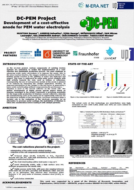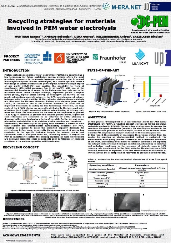 Descriere proiect: Electroliza PEM a apei reprezintă o tehnologie cheie în vederea tranziției sectorului energetic către hidrogen, ca purtător de energie și stocare a acesteia. Proiectul actual își propune să adapteze procesele de fabricație ale componentelor din partea anodică, astfel încât să se atingă o producție mai rentabilă a electrolizoarelor PEM, din punct de vedere financiar. Totodată, pentru a crește performanța celulei electrolitice, accentul trebuie să fie pus pe reacția OER de la anod, ce este crucială în cadrul electrolizoarelor PEM. Începând cu o tehnica de fabricație similară procesului de obținere a hârtiei, se vor produce colectori de curent și straturi poroase de transport din titan cu o porozitate ridicată. Ulterior, utilizând tehnici de pretratare ca hidrurarea suprafeței titanului și imobilizarea catalizatorului pe baza depunerii galvanice pulsate și/sau procese CVD se dorește reducerea considerabilă a cantității de metale prețioase, utilizate ca și catalizatori, comparativ cu electrozii de ultimă generație. În același timp, proiectul urmărește și dezvoltarea unui protocol de recuperare a metalelor prețioase din catalizatorii uzați. Transferul tehnologic către industrie va fi asigurat de către un partener industrial prezent în consorțiu și un consiliu consultativ bine stabilit.